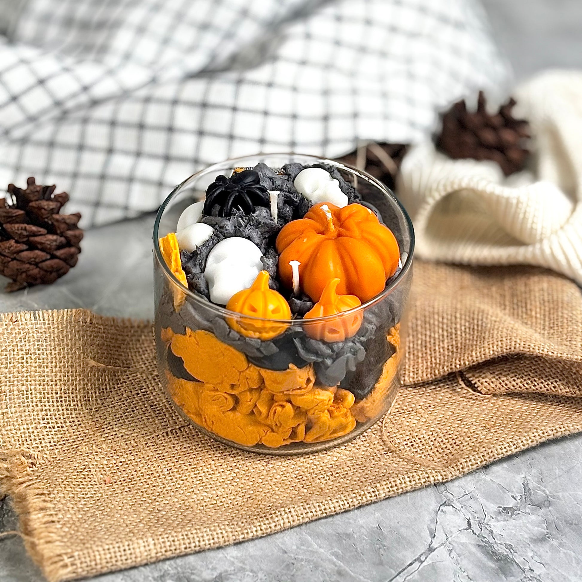 Celebrate spooky season with a cozy twist! Our Midnight Pumpkin Marshmallow Candle is hand-poured in charcoal grey and orange cream soy wax, topped with a medium-sized pumpkin fondant, skull, mini pumpkins, and a spider for the perfect Halloween vibe.