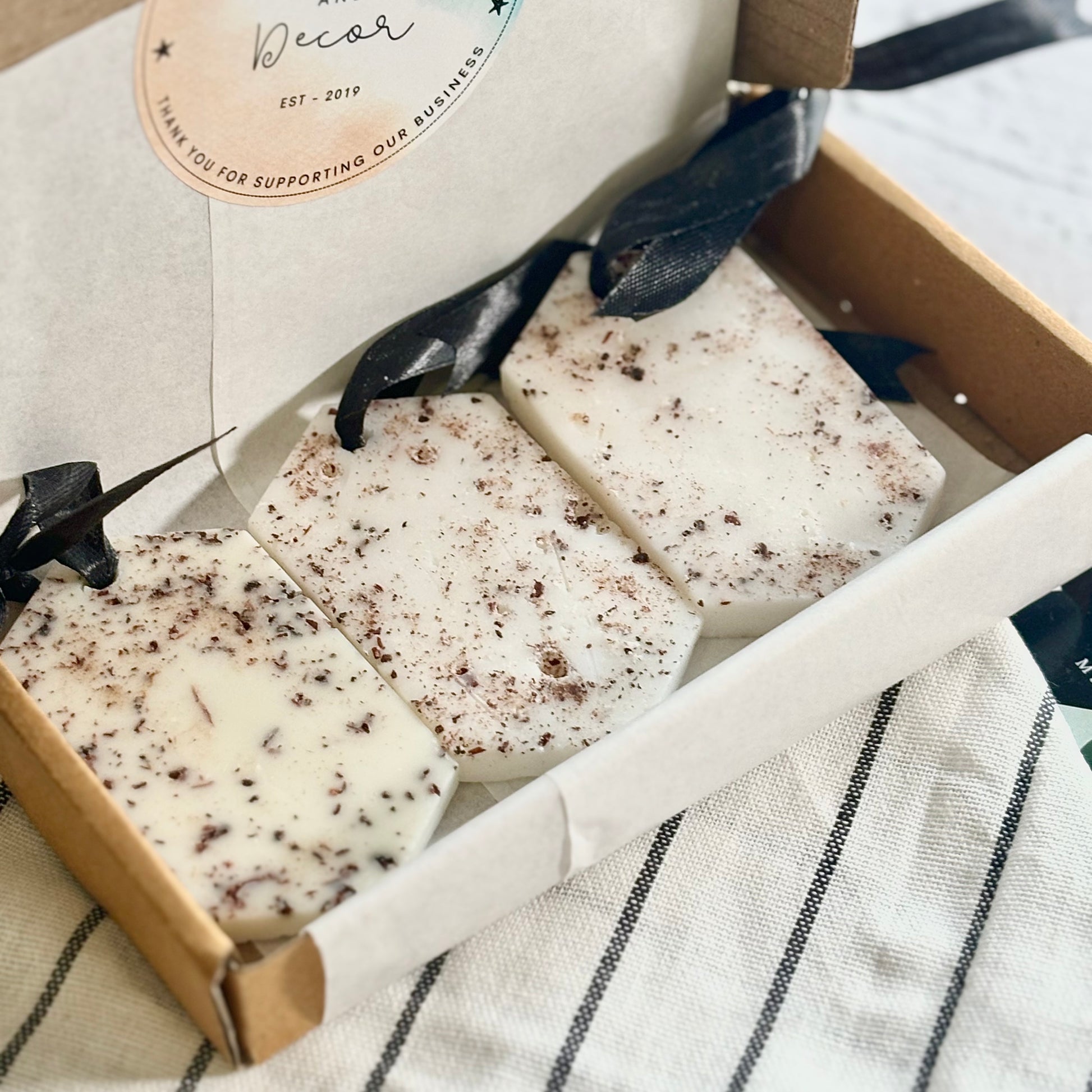 Enhance any small space with the warm and inviting scent of cinnamon and orange. Our Hexagon Shaped Cinnamon & Orange Scented Soy Wax Sachets come in a pack of 3, perfect for closets, washrooms, or even cars. These soy wax sachets are infused with cinnamon, making them ideal for freshening up any area.