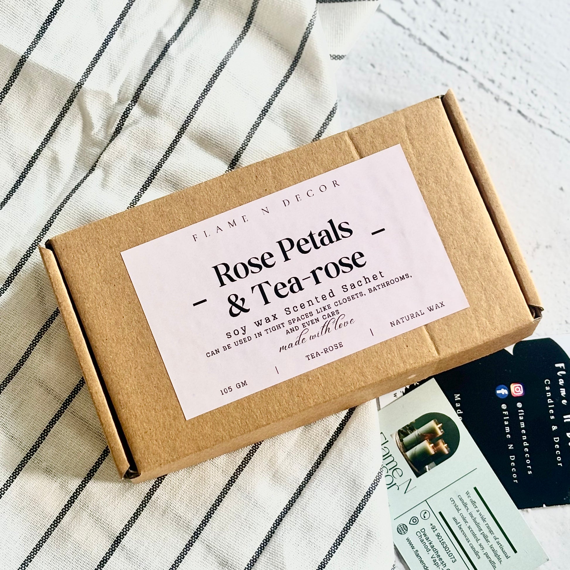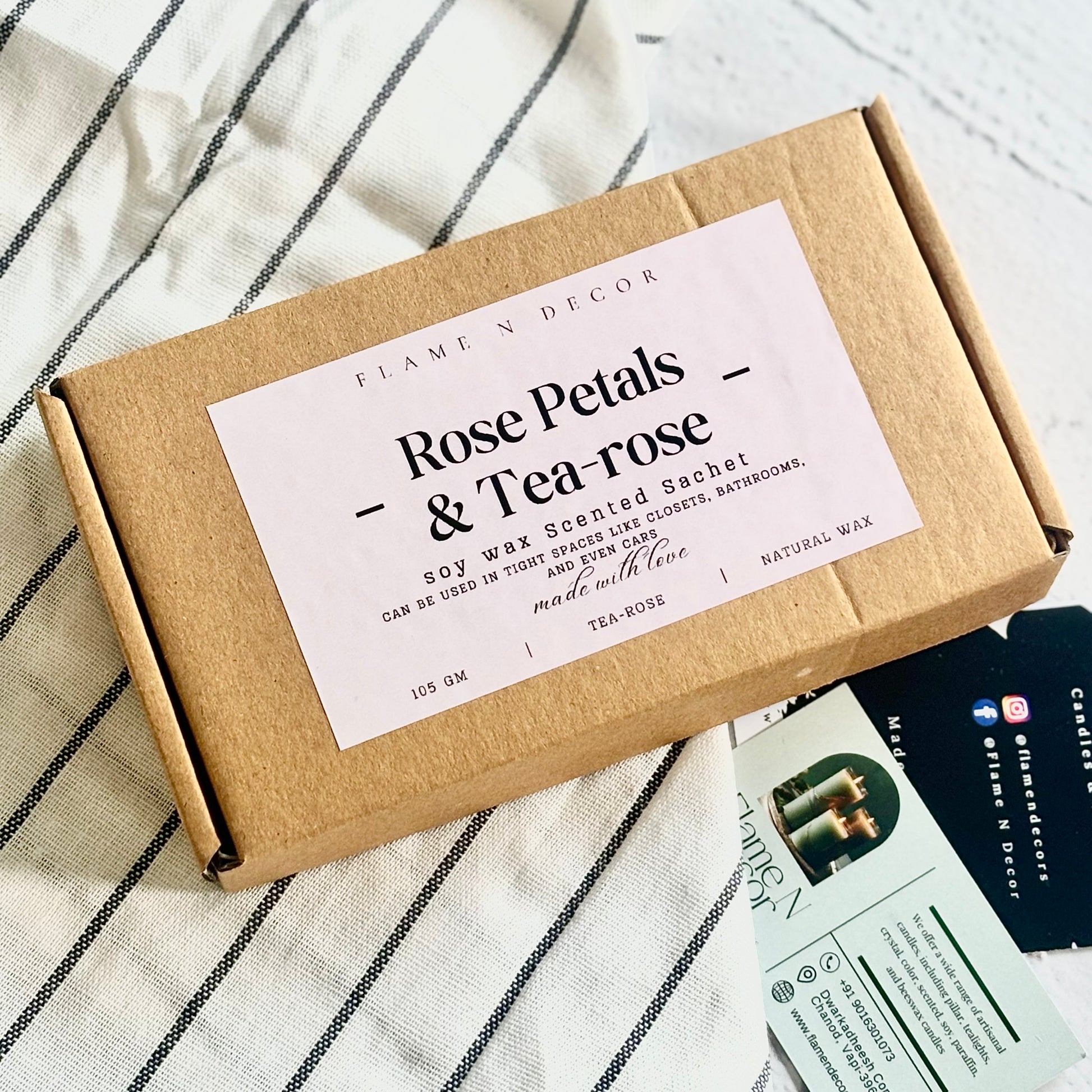 "Fill small spaces with a beautiful rose and tea-rose scent with our pack of 3 soy wax sachets. Perfect for cars, closets, washrooms, powder rooms, and more. Enjoy the natural and long-lasting aroma of our high-quality sachets."