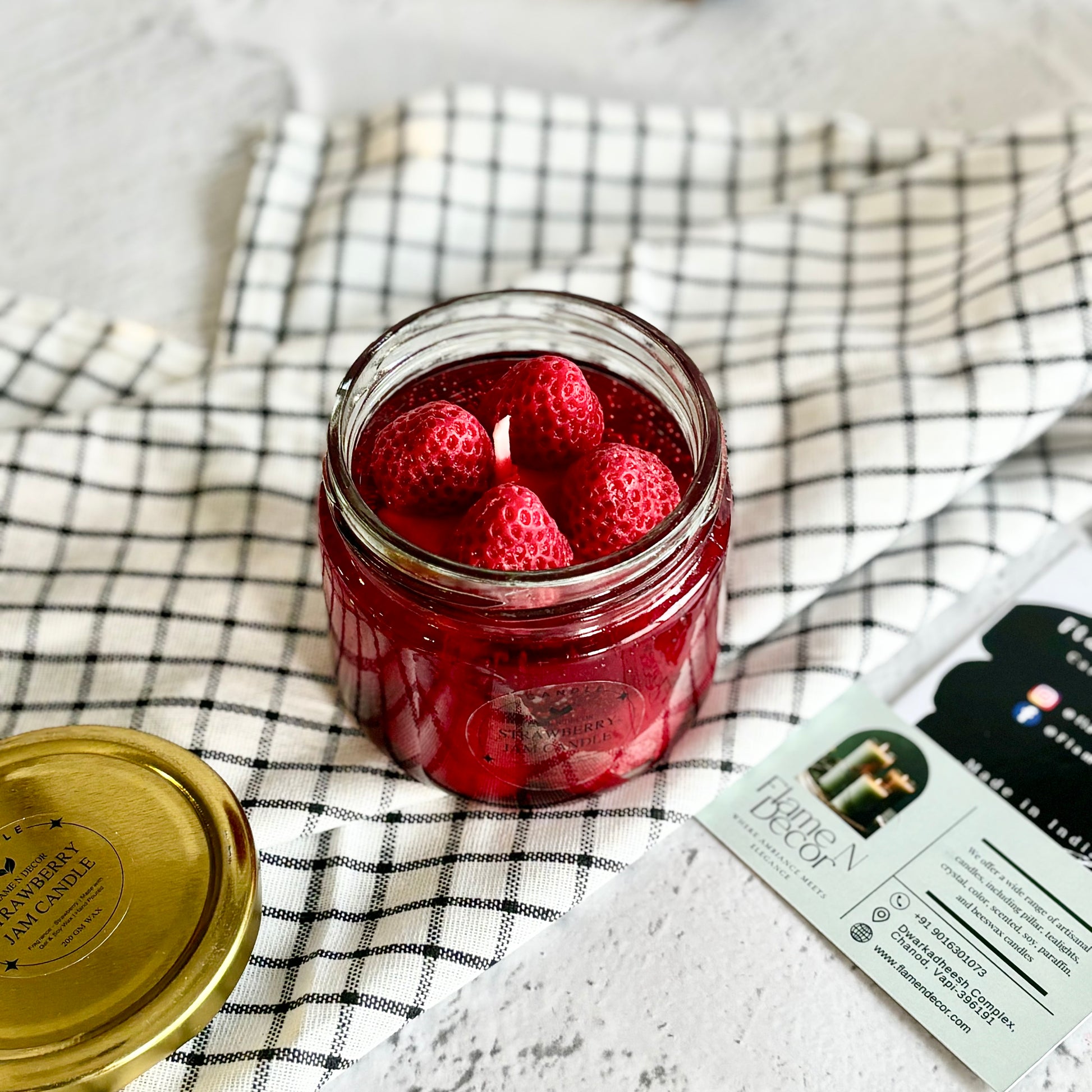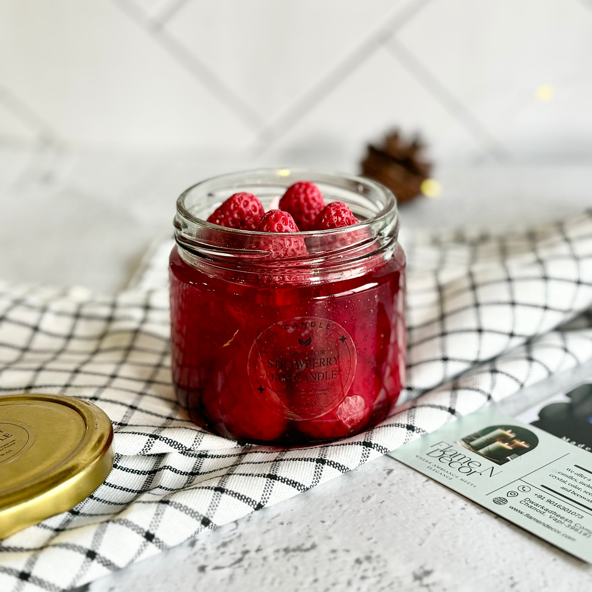 Indulge in the sweet aroma of our Strawberry Jam Scented Candle. Made with soy and gel wax, this 200 gm candle features a surprise strawberry inside. Enjoy the delicious scent of strawberries all year round, making it the perfect addition to your desert-themed or Christmas decor.