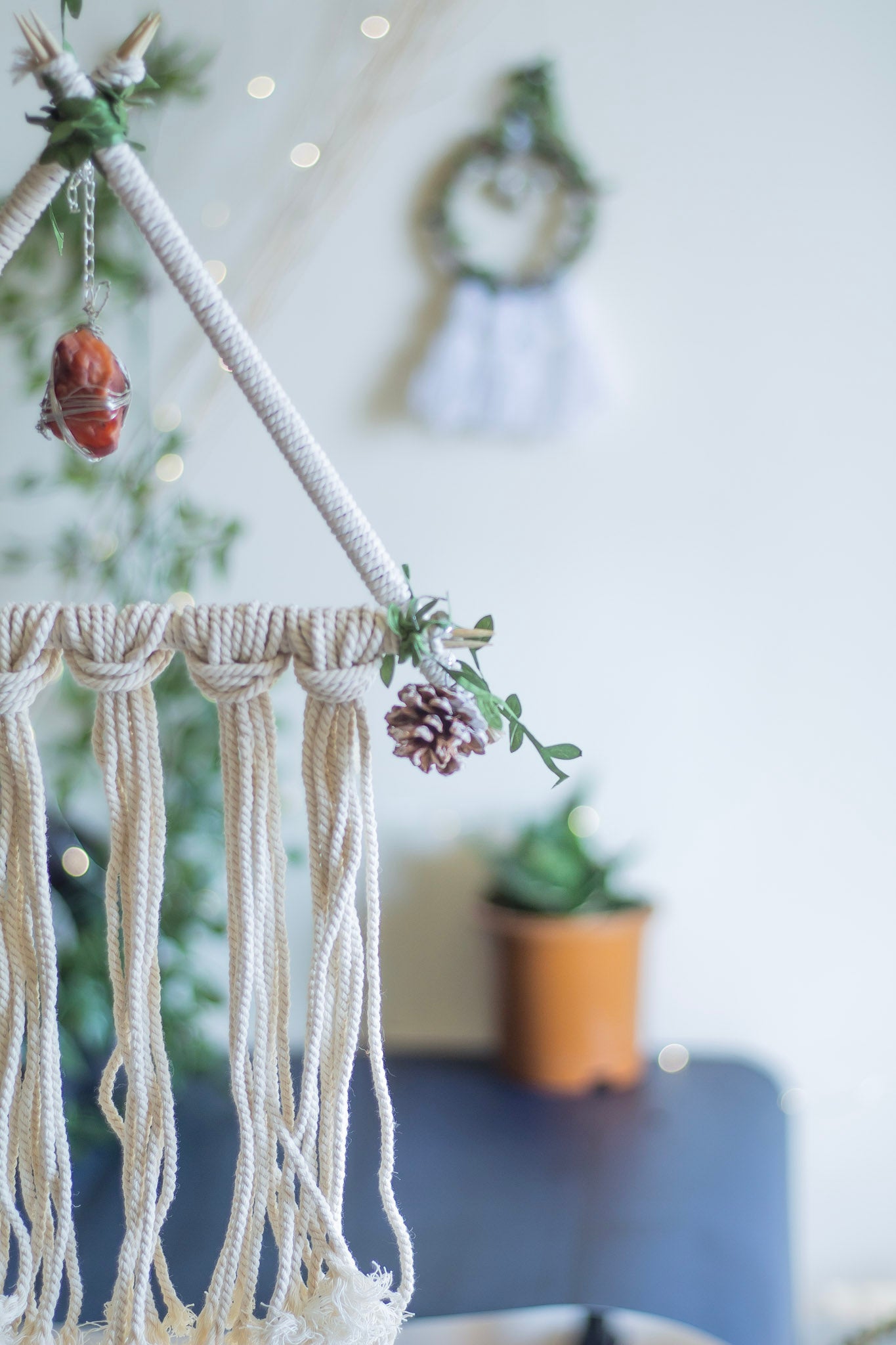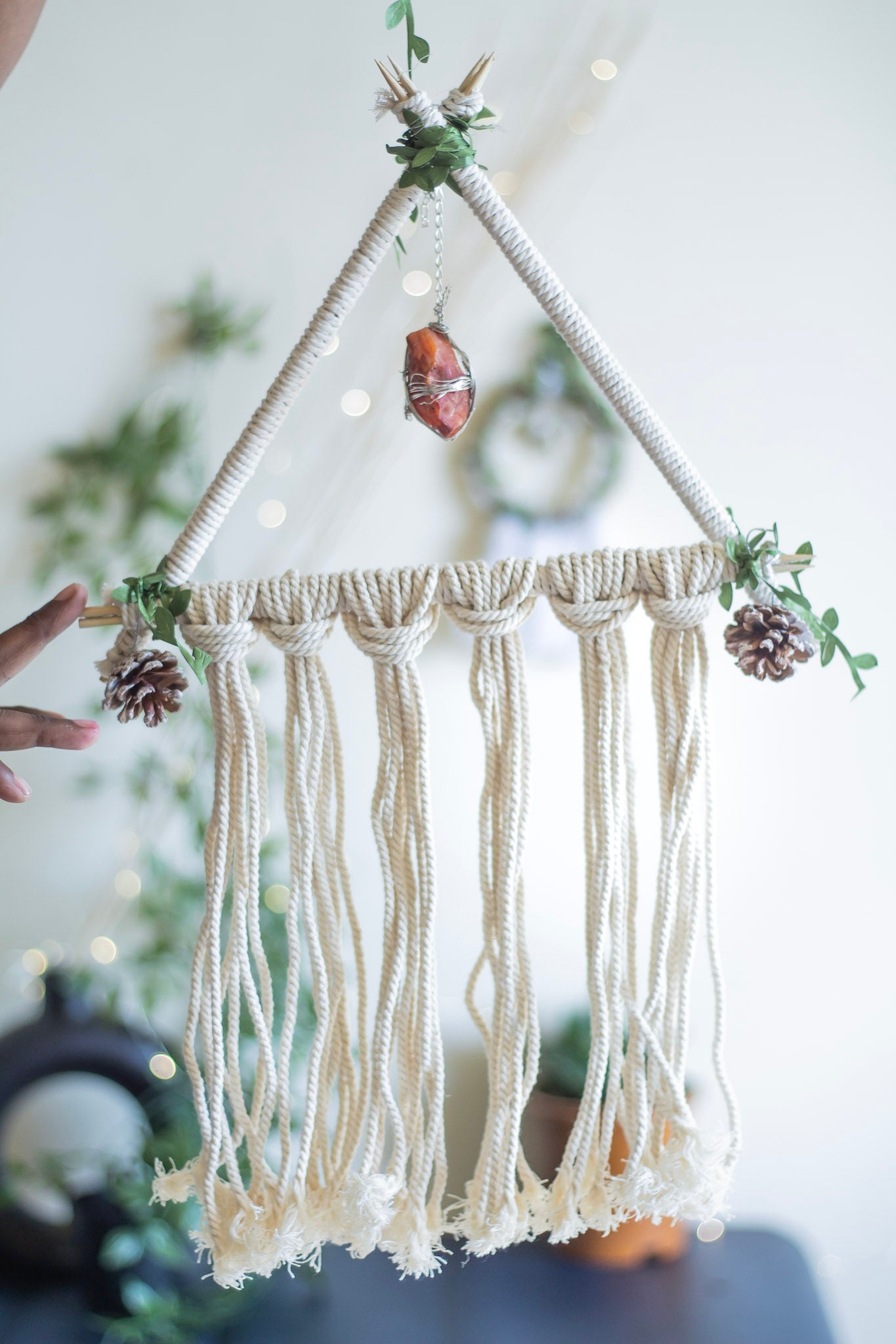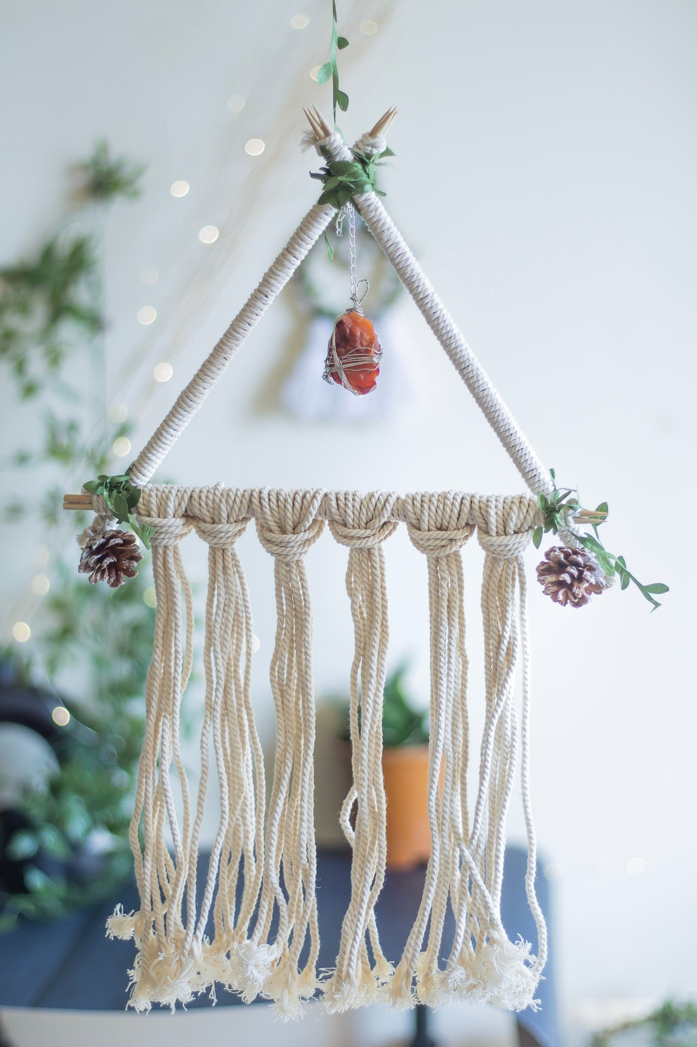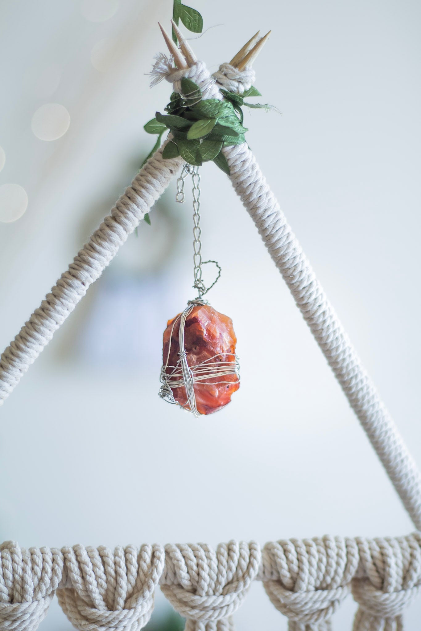 Unique Wall Hanging with Raw Orange Carnelian, decorated with green leaf string , mini pine cones - Handmade by local artician